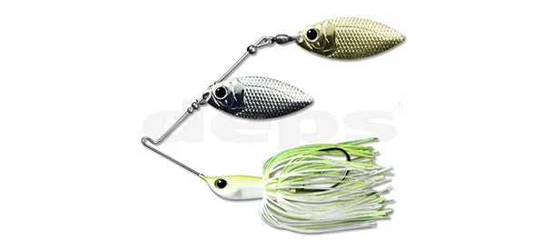 The DEPS B Custom Spinnerbait is the very first bait ever produced by DEPS, and has remained one of the most sought after spinnerbaits ever made. Â Every detail of this bait has a purpose, and this bait really set the stage for finely crafted bass fishing lures. Â The unique head design allow the B Custom to rock side to side, much more lifelike than standard spinnerbaits. Â It also allows the bait to fall horizontally, making this the best lift and fall double willow spinnerbaits ever. Â The custom wire is designed to flex at the optimum angle and tension for maximum hook setting power. Â The custom made blades are not only perfect for fluttering on a vertical drop, but they are set in place with proprietary hollow beading that allows extra vibration under the water, and the removal of the sleeve that is found on most other spinnerbaits allows greater casting distance and much less weed snagging.
