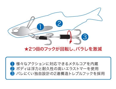 Building off the popular Nomase Wakasagi platform, the new Nomase Kozakana adds an internal harness with dual external hooks for better hook-up ratios during a straight retrieve! Â The Nomase Kozakana is a soft bodied lipless bait that vibrates hard as it comes through the water. Â The rear treble hook is attached to a swivel also so short strikers get pinned and stay pinned. Â The soft body is made of an elastomer plastic so it has great durability. Â Designed for freshwater and saltwater use, the Nomase Kozakana features saltwater safe hardware and internals. Â Toss this at a boil or run it over the top of grass or around shallow water and hold on!