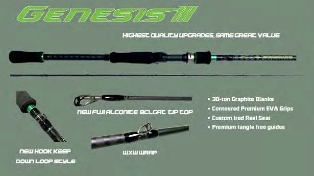 The iRod Genesis III Series Rods are high quality bass fishing rods that feature premium components and styling, yet retains an affordable price tag. iRod’s Genesis III Series of casting rods offers anglers a full line of 14 technique specific bass fishing rods that encompasses the entire spectrum of bass fishing applications; from worm fishing to chucking the big swimbaits. With design influence from several of the top professional anglers, the iRod Genesis III Rods are designed to meet the needs of bass fishermen from the novice to expert level. We offer the complete line of Genesis III Series Casting and Spinning Rods. The Genesis III Casting Rods from iRod are the second generation of iRod’s lineup of bass fishing rods. The initial success of the Genesis Series inspired iRod to seek out ways to improve their next generation. The result of their introspective analysis resulted in iRod designing the Genesis III rods to be lighter, yet still retain their precise actions and strength.